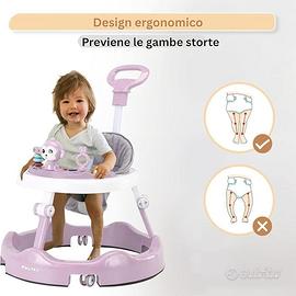 Ruote flessibili: Il baby walker Twinky è dotato di ruote flessibili che evitano i blocchi e garantiscono movimenti fluidi su ogni tipo di superficie, ideale come girello bambini.