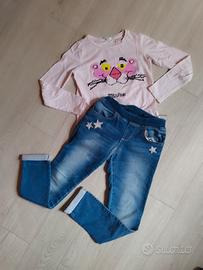- maglietta con applicazioni di girabrilla linea "Pink Panther" per H&M. Taglia 8-10 anni. Pantaloni effetto jeans, morbidi e comodi come una tuta, elastico regolabile in vita. Si può portare con o senza risvolto. Marca Benetton taglia XL, 9-10 anni. €6