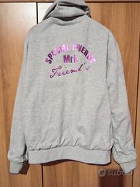 Giubbino bambina 9/10 anni double face. Parte impermeabile viola, parte in felpa grigia. Con cappuccio. Comodo per scuola o attività all'aperto. Come nuovo, solo la scritta interna presenta qualche piccolissima screpolatura