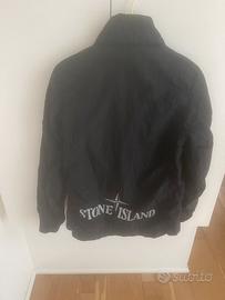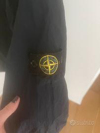 Blu in tessuto tecnico con cappuccio che si puo inserire all'interno di una tasca che si trova dietro il collo . Scritta che si illumina di notte sulla parte dietro .