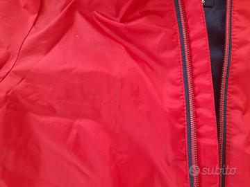 Giubbotto di colore rosso con chiusura a zip, maniche e fondo elasticizzati, cappuccio. Tessuto esterno impermeabile tipo K-Way ma con interno foderato in cotone per miglior comfort sulla pelle e maggior riparo. Leggerissimo, perfetto da portar dietro per gli improvvisi temporali estivi o le serate più fresche. Lievissimo alone sul petto visibile solo da molto vicino. Ottima fattura ed usato solo un paio di volte. Prezzo nuovo 70€. Possibilità di abbinare vantaggiosamente l'acquisto con altri capi stessa taglia