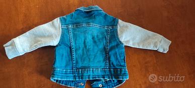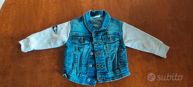 Giubbotto per neonato, perfetto per ogni occasione. Unisce lo stile del denim con la comodità della felpa. - Giacca in denim blu. - Maniche lunghe in felpa grigia. - Chiusura con bottoni.