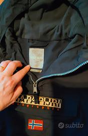 Giubbotto Napapijri colore blu scuro taglia 8 anni (130 cm). Classica cerniera sul fianco che arriva alla manica, cappuccio, tascona sul davanti, foderato in morbido pile. Ottime condizioni, unisex.