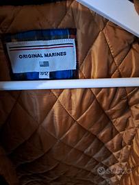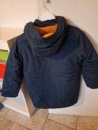 giubbotto imbottito blu con interno arancione. cappuccio, cerniera e alamari, 2 tasche capienti, maniche con bottone e maglia. in ottimo stato.