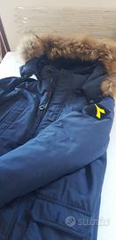 Giubbotto/parka invernale idrorepellente blu marca DIADORA con interno imbottito colore contrasto mimetico giallo con bretelle simpatiche per togliere il giaccone e non tenerlo.in mano. i bambini si divertono un mondo.