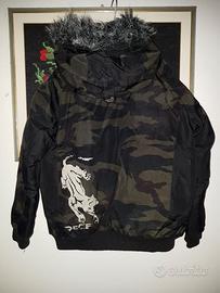 Giubbotto imbottito con cappuccio e pelliccia ecologica staccabile, tanti tasche esterne e interne, chiusura a zip e bottoni, età 12 anni, in tessuto impermeabile, colore verde militare, firmato Recel. Usato, ma in buoni condizioni.