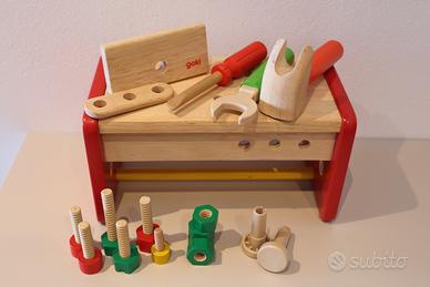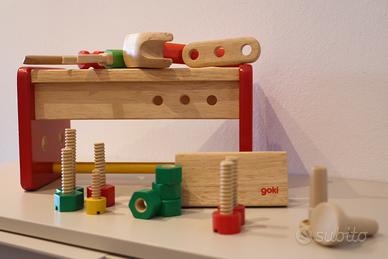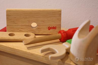 Goki- Banco da Lavoro in legno con Box Porta Attrezzi. Gioco in ottime condizioni come da foto. La scatola in cartone è rovinata.