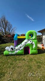 Gonfiabile Puppyland da giardino, 3-6 anni. Lo scivolo misura cm 350*340*245 (lunghezza* larghezza*altezza) peso kg 1. Materiali PVC/ nylon laminato. Tempo di gonfiaggio max 1 min. Peso max consentito 180 kg Dimensioni imballi cm 76* 45 * 43. Peso imballo kg 30. Fornito con accessori necessari: gonfiatore elettrico AC 220-249 Volt, 620-680 Watt, manuale in italiano, borsa per il trasporto, sistema di ancoraggio, kit di riparazione. Checklist certificata TUV, CE. Con camere d’aria interne e non visibili esternenrw che garantiscono il flusso d’aria omoegeno durante i salti dei bambini. In PERFETTO stato senza difetti e/o usura. Prezzo se acquistato nuovo online 700-940 €
