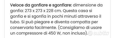 273 x 273 x 228 Castello gonfiabile con scivolo per bambini. adatto a 2 bambini peso max 90kg necessita di compressore per gonfiarlo.