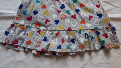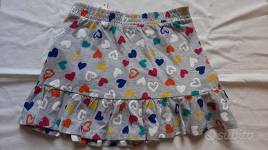 Nuova con cartellino e quindi mai indossata. Gonna corta con gale da bambina. Colore grigio chiaro con cuori colorati ed elastico in vita. Tessuto 95% cotone 5% viscosa. Taglia 6-7 anni (122 cm). Marca Oviesse Kids
