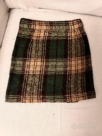Graziosa gonna scozzese in lana, fantasia tartan verde e cammello, con ricamo di Paperino sul davanti.