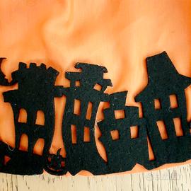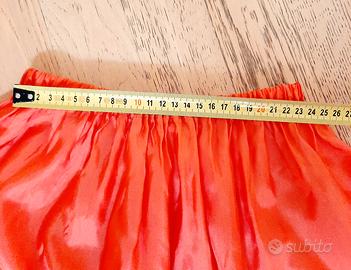 Gonna in raso arancione perfetta per Halloween. È stata realizzata da una costumista: ha applicazioni in feltro a forma di case dei fantasmi e pipistrelli con occhi glitter. La vita è elasticizzata perciò si adatta a più taglie, si estende da cm 25 a cm 31 circa.
