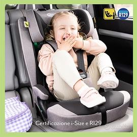 Certificazione i-Size e R129 in entrambe le modalità; agganci ISOFIX a sgancio automatico; installazione del Top Tether in modalità rialzo con cinture integrate