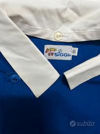 Colore blu royal, colletto bianco, chiusura con bottoni frontali.