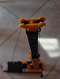 Gru gialla con braccio con varie altezze, metallo e plastica.