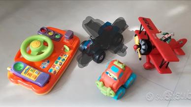 Gruppo di 3 giocattoli formato da aereoplano con personaggio fisher price + auto maxi ruote colorata + base sonora con volante tasti musicali e telefono sganciabile. Tutto in ottime condizioni. Zona fuorigrotta