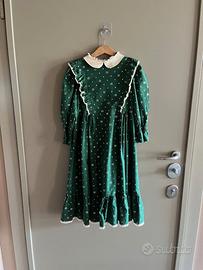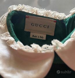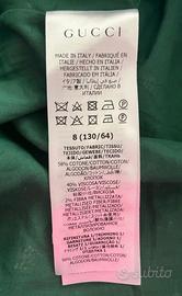 Abito bambina Gucci autentico, lungo in cotone e seta colore verde con contrasti panna, con fodera interna in cotone. Ricami GG all over con filo argentato a contrasto. Vestibilità regolare, finiture con ruches, chiusura con zip posteriore. Taglia 8 anni (fino a 130 cm di altezza). Nuovo, mai indossato, in confezione originale con scatola e cartellino. Misure: Lunghezza: 83 cm Manica: 40 cm Spalle: 32 cm Sottoascella: 34 cm