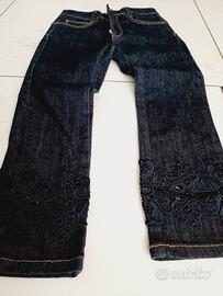 Jeans blu scuro a micro righe argentate. Taglio a sigaretta con 2 tasche anteriori con logo sulla sx e 2 tasche posteriori.