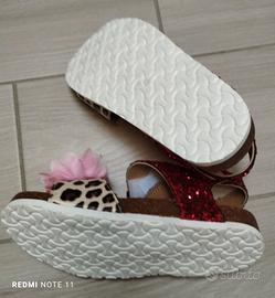 Guess, sandaletti modello Sophie per bambina, in ecopelle, cinturino alla caviglia con glitter e chiusura a strappo con velcro, fascia frontale con stampa animalier, motivo leopardato e applicazioni floreali in organza color rosa e rosso, plateau effetto sughero. Mai utilizzati, n. 30.