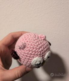 Adorabile gufo rosa realizzato all'uncinetto, perfetto come decorazione o giocattolo.