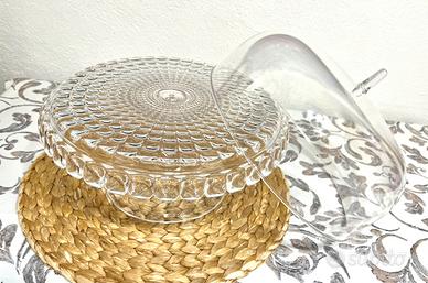 Alzata con campana caratterizzata da base e campana dalle superfici lisce e dal piatto realizzato con la distintiva lavorazione a quadretti in rilievo di Tiffany.