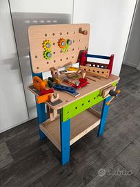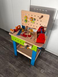 Vendo banco attrezzi in legno della Hape, corredato con cassettina degli attrezzi “little dutch”. Tutto in legno, con tutti gli accessori (martello, cacciavite, sega, punteruolo, ingranaggi e guide. …)