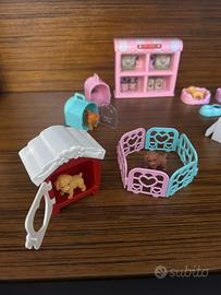 Happy Pets center, con 5 cagnolini, 2 trasportini, 3 cucce, 2 ciotole pappa, 3 ossi, 3 collari, un guinzaglio, vetrina con cibo per i cani.