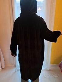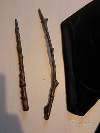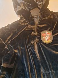 Mantello con cappuccio, in velluto nero non foderato, unico fatto a mano, lungo dalla spalla 91, larghezza spalle46, lunghezza braccio 43 età 7/9 anni , con stemma Grifondoro, ma sostituibile con stemma di altre case, in più bacchetta fatta in casa. 15 euro