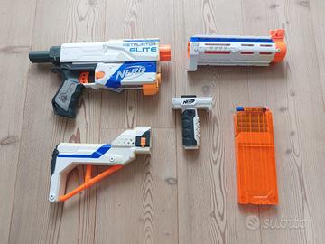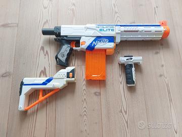 Vendo Hasbro NERF - Elite Retaliator provvisto di tutti i pezzi e di alcune cartucce. Alcuni parti in plastica bianche presentano ingiallimento da usura (il funzionamento della pistola non viene compromesso).