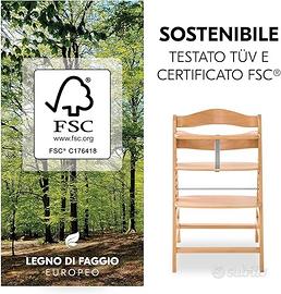 Rispettoso dell'ambiente: il sediolone pappa bimbi è realizzato in legno di faggio proveniente da foreste cert. FSC in modo da proteggere le foreste stesse, le piante e gli animali