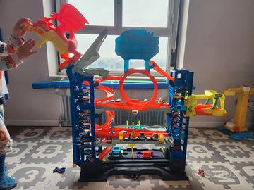 Playset con quattro livelli di gioco e drago divora auto, con 2 macchinine die-cast e box per riporre 50 veicoli in scala 1:64, 4+ anni