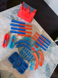 Include una base (la scatola), pezzi di pista, curve con parapetti, coperchio con zona di scontro, lanciatori, deviatore. In regalo 5 automobiline Hotwheels