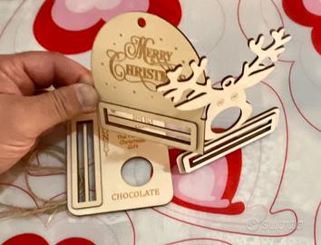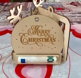 Cedo tre oggetti porta doldi in legno dove inserire una o piu banconote arrotolate da regalare per natale. Un modo originale e simpatico. In due (nella renna e in quello quadrato) si possono inserire dei cioccolattini tipo Lindt…ho gia provato e sono perfetti. Si pisdono semplicenente appendere all’albero o mettere in una bustina…sono adatti a tutte le banconote. Non scambio e no perditempo. 3 pezzi in busta trasparente.