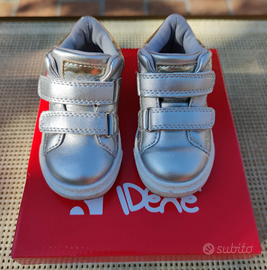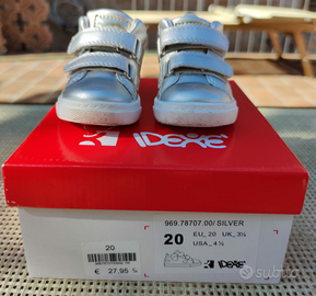 Carinissime scarpine sneakers per bimba, marca Idexe, colore argento, con cuori color oro e nero, numero 20.