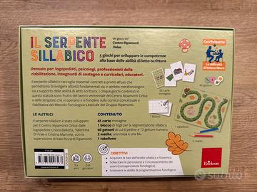 Il serpente sillabico raccoglie materiali concreti e pronti all'uso che permettono di svolgere attività fondamentali sia in ambito metafonologico sia a supporto delle abilità di letto scrittura. I cinque giochi contenuti in questa scatola sono frutto del lavoro ventennale del Centro Ripamonti Onlus e delle terapiste che vi operano e si fondano sulla cornice concettuale e riabilitativa del Metodo Fonologico-Lessicale del Gruppo Ripamonti.