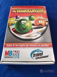 Vendo trabocchetto della MB, gioco adatto a tutta la famiglia ed a bambini di età superiore ai 6 anni, composto da una griglia sulla quale si interseca un reticolato formato da segmenti rossi e bianchi, sui quali però ci sono dei buchi. Comandati da apposite leve, questi segmenti vanno spostati in maniera tale da far cadere il maggior numero di palline possibili. I set di palline sono di quattro colori molto ben distinguibili quando si gioca in 4. Al Trabocchetto si può giocare da 2 a 4 giocatori e lo scopo del gioco è davvero semplice, quasi banale se vogliamo: far cadere le biglie degli avversari nei buchi, tenendo in vita le nostre palline o meglio almeno una pallina, così da vincere la partita. Le proprie mosse vanno dunque studiate con calma e attenzione, perché uno spostamento avventato potrebbe avvantaggiare gli avversari. Si gioca a turno e occorre spostare le leve in varie posizioni: c'è quella di base, quella di mezzo e quella finale, e ci si può muovere solamente di una tacca alla volta. Un gioco sempre divertente, nonostante sia in commercio da circa 40 anni, che vi permette di fare tante numerose partite, dato che un match solitamente dura quindici minuti.