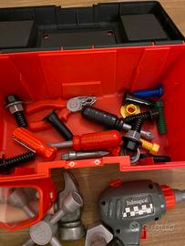 Cassetta attrezzi immaginario, con trapano che funziiba a pila, pinze, tenaglie, martello, cacciaviti, viti, bulloni..,