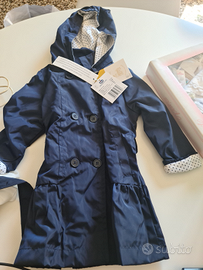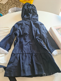 Elegante impermeabile per bambina Chicco blu con interno bianco a pois blu e cappuccio. Mai usato con cartellino.