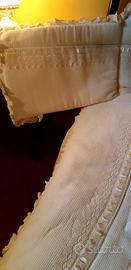 Vendesi coordinato piumone e paracolpi per lettino culla. Colore beige, impreziosito da ricami, merletti e nastrini. Buone condizioni