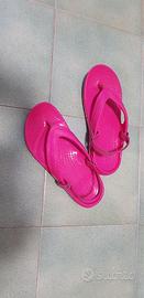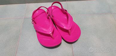 Infradito Crocs bimba con elastico, colore fuxia, tenute benissimo taglia C12, corrispondente alla taglia 29-30. A disposizione anche taglia J1, corrispondente alla taglia 32-33, sempre fuxia come nella fotografia ma senza elastico.