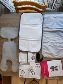 - riduttori, coperta passeggino, porta bicchiere, borsa inglesina, stand culletta, manuali originali e varie.