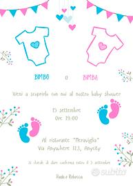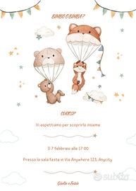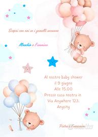 Inviti per baby shower o gender reveal, personalizzabili, da inviare direttamente su whatsapp o per email agli invitati. Temi disponibili:
