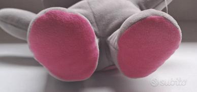 Ippopotamo grigio con orecchie,muso,piedi e cuore rosa.Ha una faccia con occhi e sopracciglia tutte cucite.Se vieni scosso si può sentire un rumore pi perline.Il divertimento al gioco e assicurato!👍