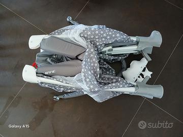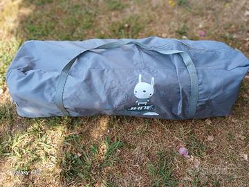 É provvisto di ruote per spostamenti rapidi, di una comoda finestra con cerniera per un accesso più agevolato e di una barragiochi decorata con simpatici peluche appesi.