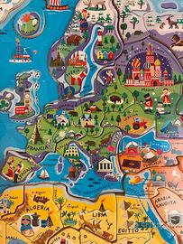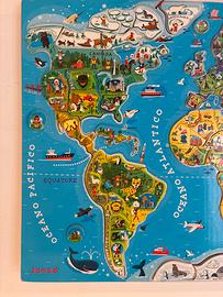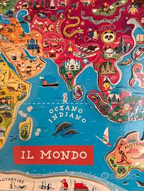Grande puzzle in legno con 92 pezzi calamitati, ognuno corrisponde ad un paese o zona del mondo, con nome, capitale e illustrazioni degli elementi caratteristici del luogo. Si può appendere alla parete: i pezzi magnetici del puzzle non crollano!