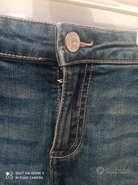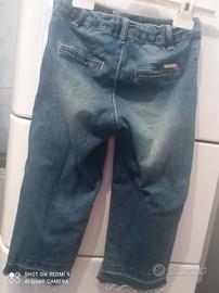 Jeans a palazzo cioè larghi sotto e devono a 3/4 della lunghezza gamba. Colore blu. Misure: interno gamba 37 cm, esterno gamba, vita regolabile da 50 a 60 cm. , larghezza gamba 16 cm.