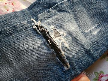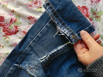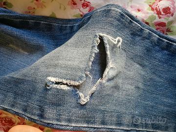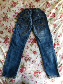 Jeans da bambino taglia 4-5 anni (110 cm) marca zara kids, vita aggiustabile grazie agli elastici all'interno (in foto é tanto tirato). Strappi sulle ginocchia e bordo usurato, ma essendo un jeans fa stile. Se non piace che gli strappi mostrino direttamente la pelle si può applicare un pezzo di jeans o di stoffa all'interno (su richiesta posso farlo anche io, a fronte di un compenso simbolico).