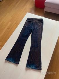 Jeans leggermente a zampa, colore scuro con riflessi dorati. Hanno l’elastico in vita per poterli regolare, chiusura con bottone e cerniera.