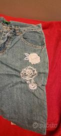 Jeans corti bambina 12 anni Benetton. - Lunghezza al ginocchio. - Dettaglio pizzo sul fondo. - Applicazioni floreali ricamate sulla gamba.