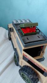 Jeep giocattolo interamente in plastica con portellone posteriore apribile. Ruote removibili. Supporti sottoruota ad incastro con la parte del tettuccio come la valigetta contenente 3 taniche di benzina in plastica. Argano anteriore allungabile fino a 19 cm e retraibile con il tasto rosso sul cofano.
